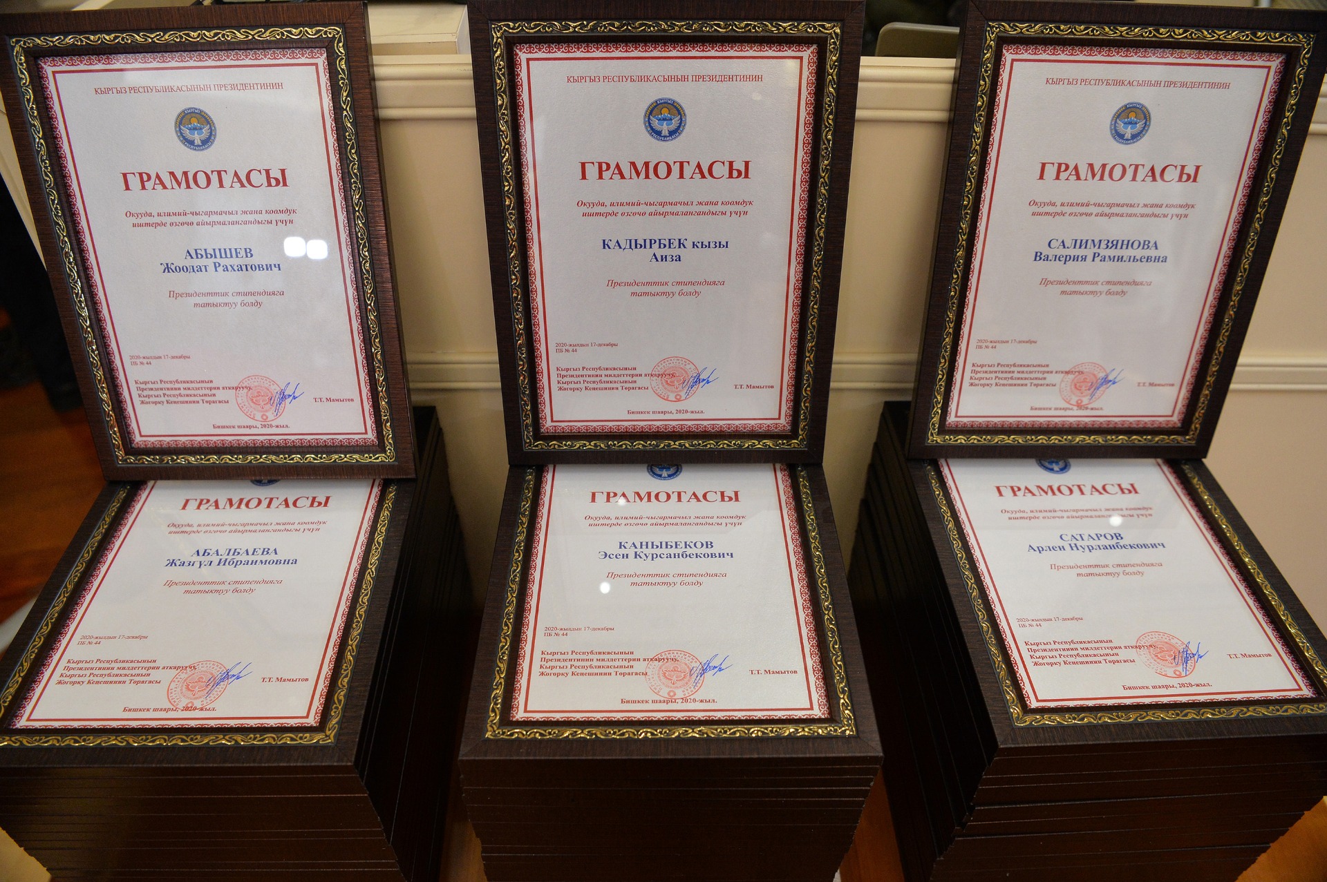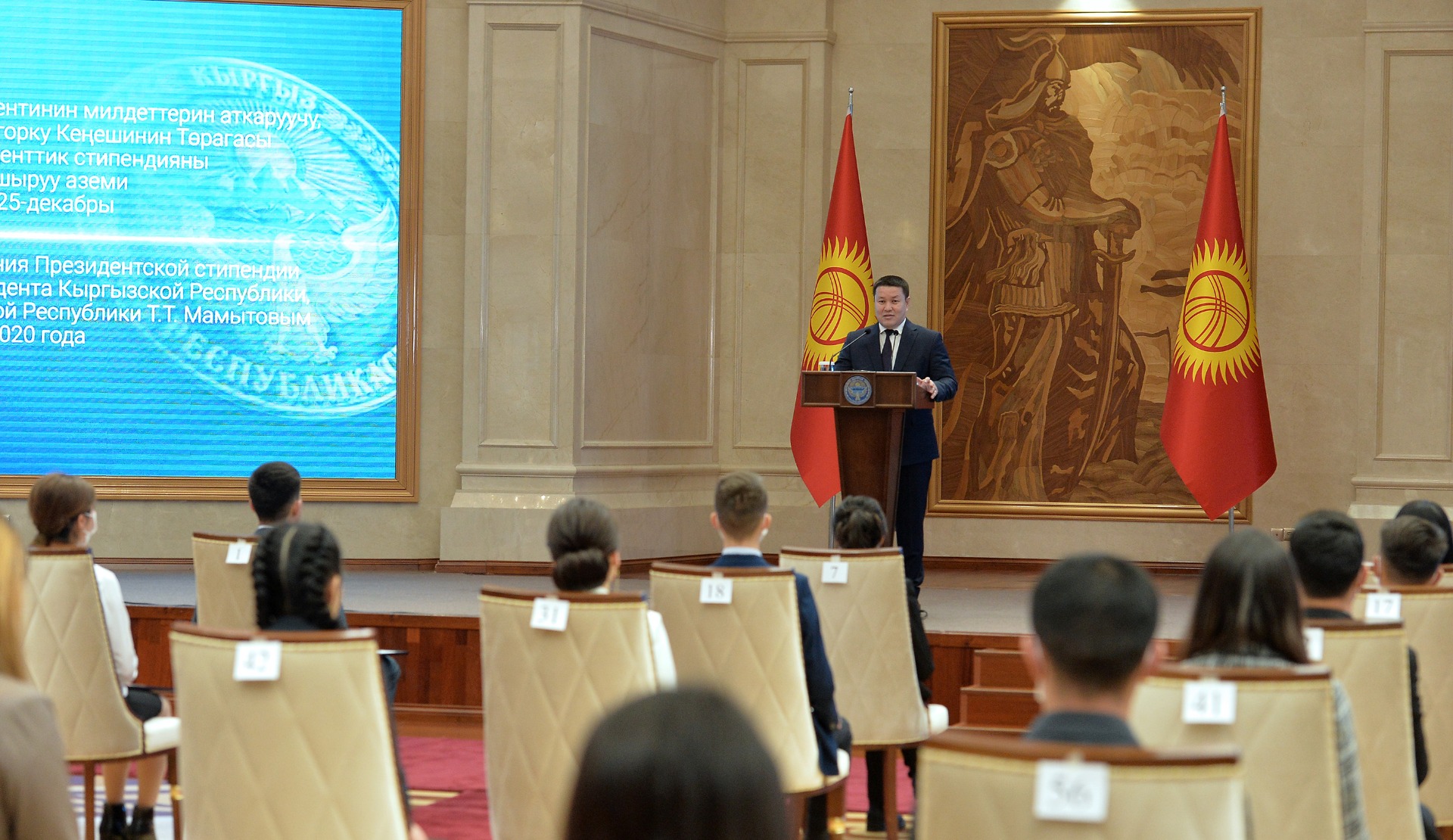 Исполняющий обязанности президента спикер парламента Талант Мамытов вручил президентские стипендии 70 студентам высших учебных заведений страны, которые были признаны лучшими по итогам 2019-2020 учебного года. Об этом сообщает пресс-служба президента.