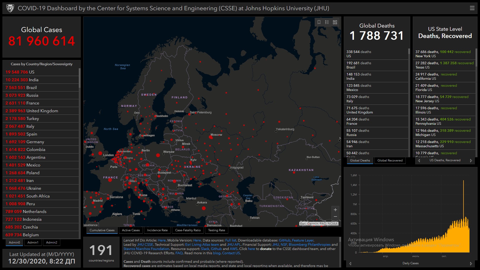 Всего в мире коронавирусом заразились 81 миллион 960 тысяч 614 человек. Больше всего зараженных в США (19 миллионов 548 тысяч 706), Индии (10 миллионов 224 тысячи 303), Бразилии (7 миллионов 563 тысячи 551), России (3 миллиона 73 тысячи 923), Франции (2 миллиона 631 тысяча 110), Великобритании (2 миллиона 389 тысяч 963), Турции (2 миллиона 178 тысяч 580), Италии (2 миллиона 67 тысяч 487), Испании (1 миллион 893 тысячи 502), Германии (1 миллион 692 тысячи 109) и Колумбии (1 миллион 614 тысяч 822).