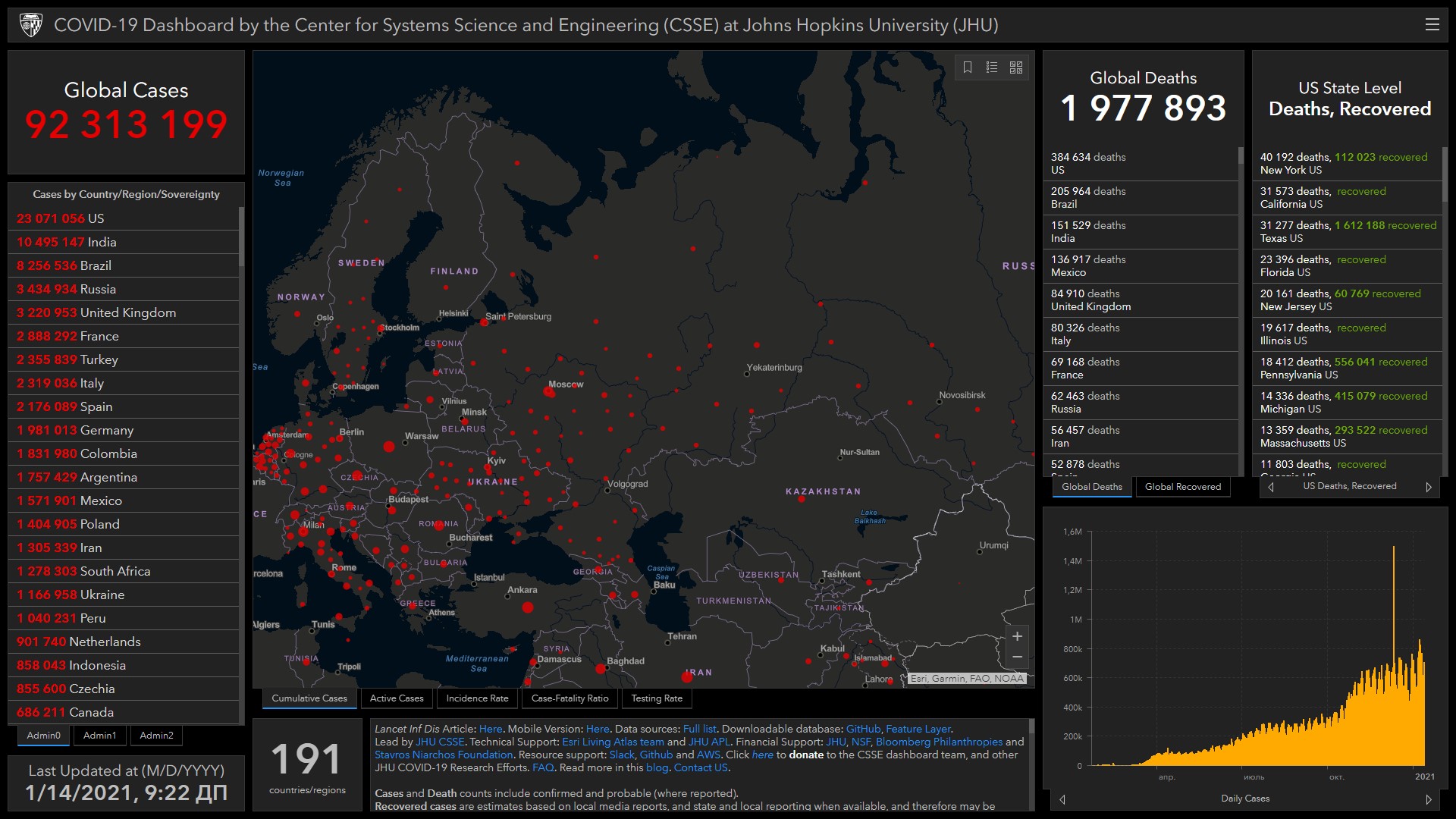 Всего в мире коронавирусом заразились 92 миллиона 313 тысяч 199 человек. Больше всего зараженных в США (23 миллиона 71 тысяча 56), Индии (10 миллионов 495 тысяч 147), Бразилии (8 миллионов 256 тысяч 536), России (3 миллиона 434 тысячи 934), Великобритании (3 миллиона 220 тысяч 953), Франции (2 миллиона 888 тысяч 292), Турции (2 миллиона 355 тысяч 839), Италии (2 миллиона 319 тысяч 36), Испании (2 миллиона 176 тысяч 89), Германии (1 миллион 981 тысяча 13) и Колумбии (1 миллион 831 тысяча 980).