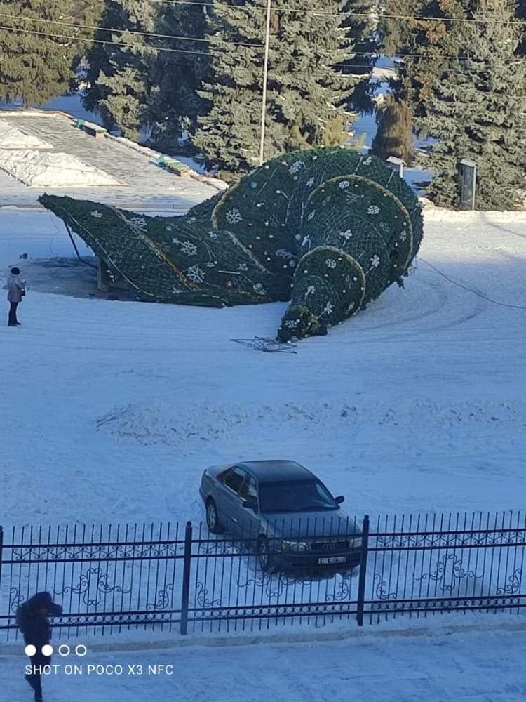 Уточняется, что символ Нового года был установлен около здания Иссык-Кульского государственного института. Елка упала после сильного шквального ветра сегодня утром.
