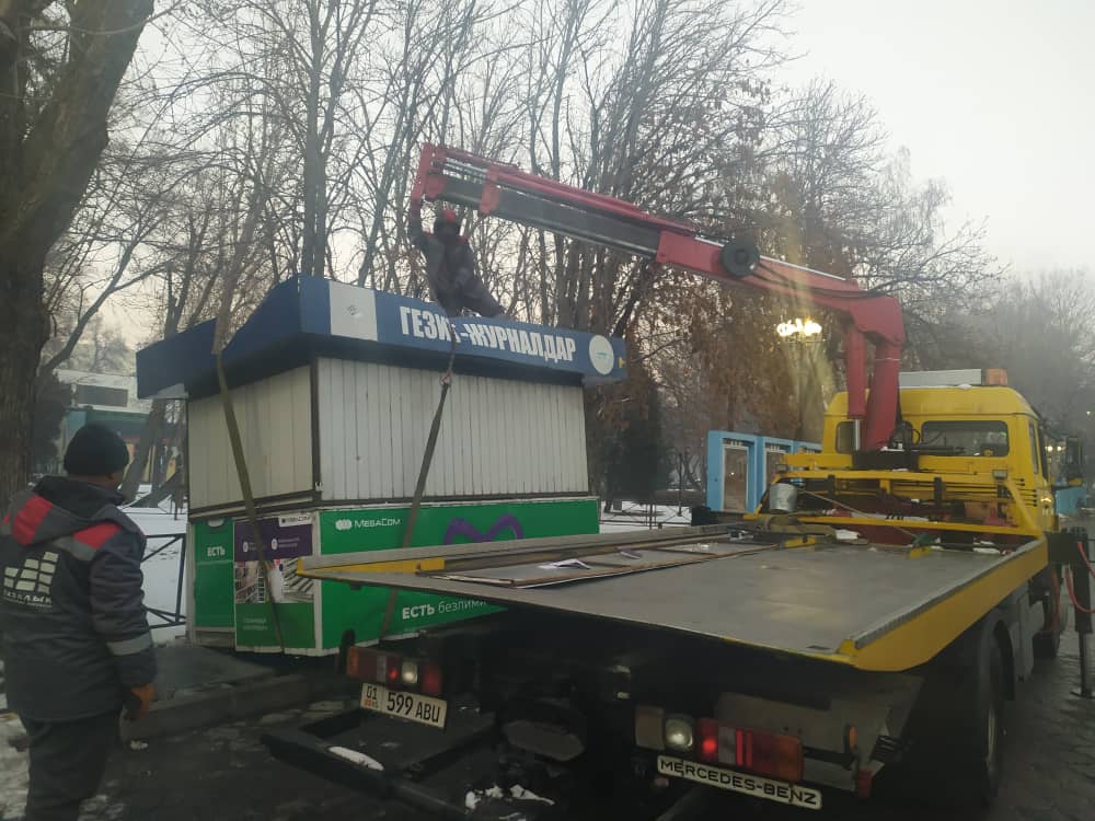 Убрали и газетный киоск, установленный без разрешительных документов на пересечении проспекта Чуй и бульвара Эркиндик, а также павильон на улице Худайбергенова, 94а.