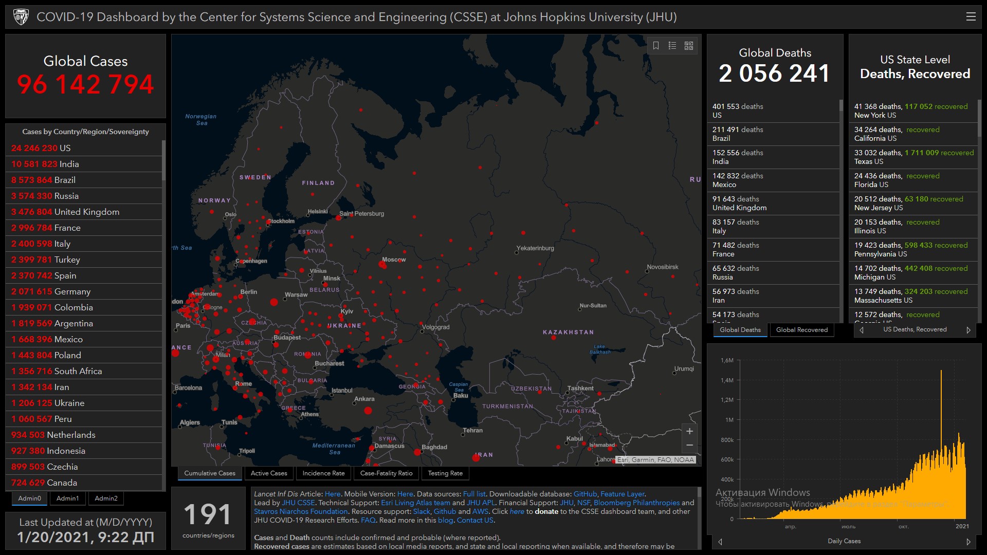 Всего в мире коронавирусом заразились 96 миллионов 142 тысячи 794 человека. Больше всего зараженных в США (24 миллиона 246 тысяч 230), Индии (10 миллионов 581 тысяча 823), Бразилии (8 миллионов 573 тысячи 864), России (3 миллиона 574 тысячи 330), Великобритании (3 миллиона 476 тысяч 804), Франции (2 миллиона 996 тысяч 784), Италии (2 миллиона 400 тысяч 598), Турции (2 миллиона 399 тысяч 781), Испании (2 миллиона 370 тысяч 742), Германии (2 миллиона 71 тысяча 615) и Колумбии (1 миллион 939 тысяч 71).