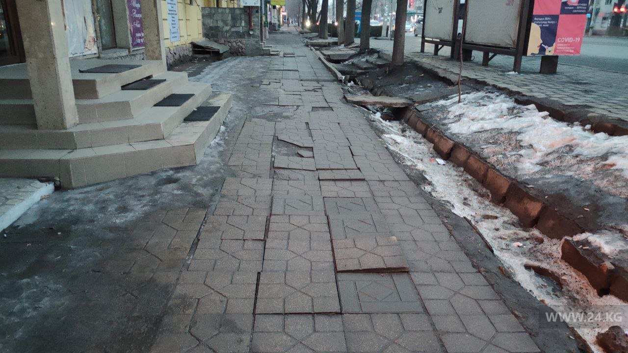 Разбитый тротуар в центре Бишкека обещают отремонтировать в апреле. Об этом 24-kg.com сообщили в пресс-службе мэрии столицы.
