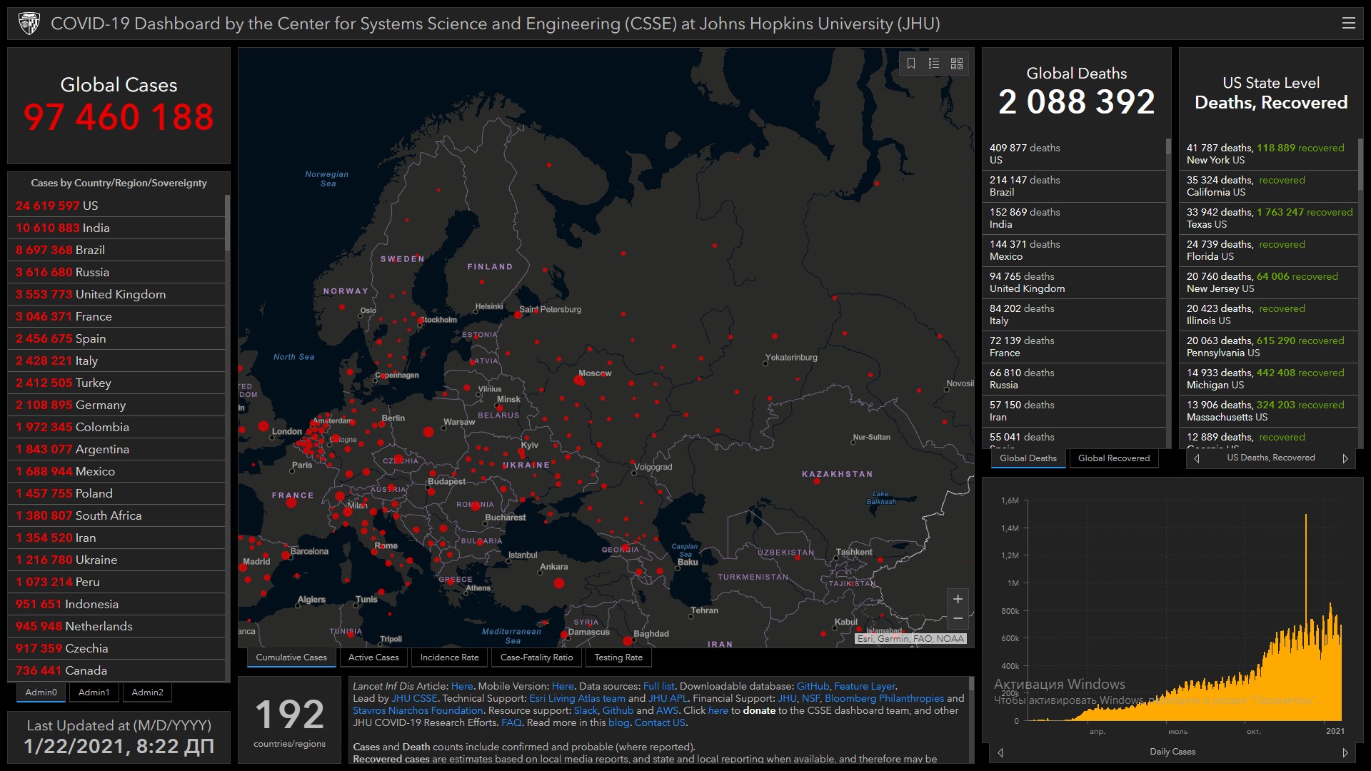 Всего в мире коронавирусом заразились 97 миллионов 460 тысяч 188 человек. Больше всего зараженных в США (24 миллиона 619 тысяч 597), Индии (10 миллионов 610 тысяч 883), Бразилии (8 миллионов 697 тысяч 368), России (3 миллиона 616 тысяч 680), Великобритании (3 миллиона 553 тысячи 773), Франции (3 миллиона 46 тысяч 371), Испании (2 миллиона 456 тысяч 675), Италии (2 миллиона 428 тысяч 221), Турции (2 миллиона 412 тысяч 505), Германии (2 миллиона 108 тысяч 895) и Колумбии (1 миллион 972 тысячи 345).