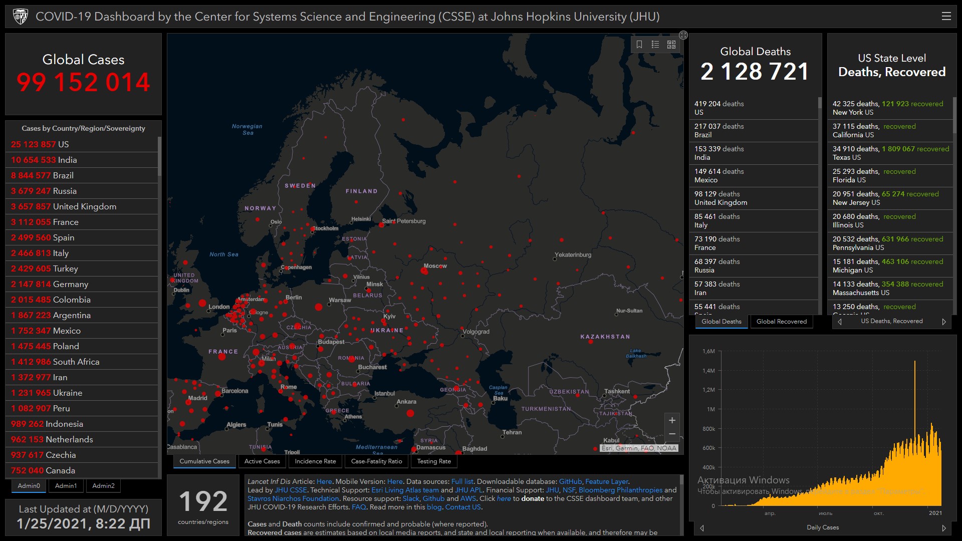 COVID-19 в мире. Заразились более 99,1 миллиона, умерли более 2,1 миллиона