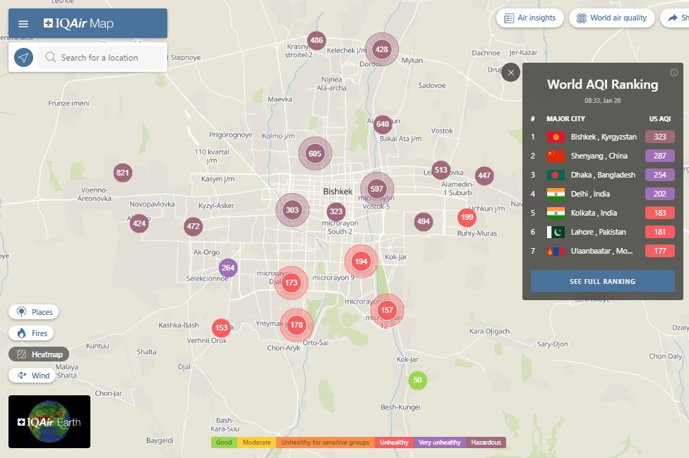 В рейтинге крупнейших городов мира по качеству воздуха World Air Quality Бишкек поднялся на первое место.