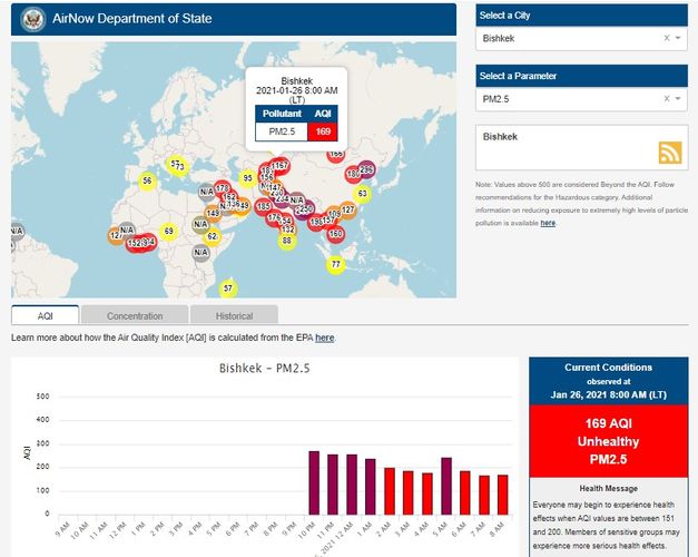 Информация обновляется каждый час. На 8.00 индекс качества воздуха в районе дипломатической миссии — 169 (AQI).