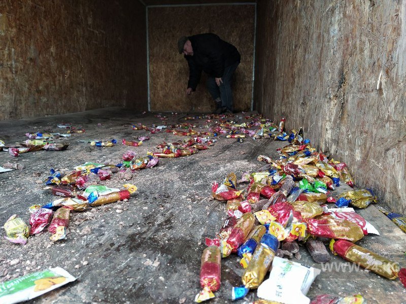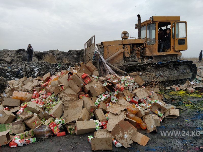 На складе оперативники выявили 5 тонн натуральных соков и больше 5 тысяч коробок печенья и конфет, чей срок годности вышел еще два года назад. Продукты было решено закатать трактором в городскую свалку.«Эта продукция была завезена к нам с Украины», — уточнил начальник городской Финполиции.