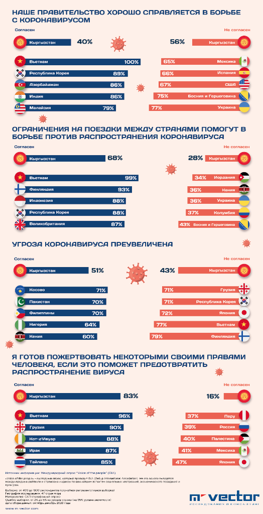 68 процентов участников исследования уверены, что ограничения на поездки между странами помогут в борьбе против распространения коронавируса. «Результаты опроса показали, что ажиотаж по поводу коронавируса поутих. Наблюдаются изменения в мнениях кыргызстанцев относительно COVID-19 по сравнению с началом 2020 года», — отмечают авторы исследования.