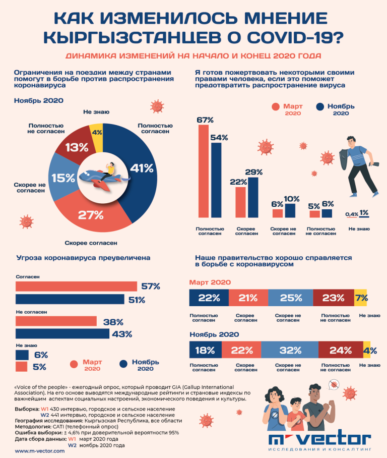 51 процент кыргызстанцев все еще считают, что угроза от коронавируса преувеличена. Такие результаты получены в ходе опроса, итоги которого представила исследовательская компания «М-Вектор».