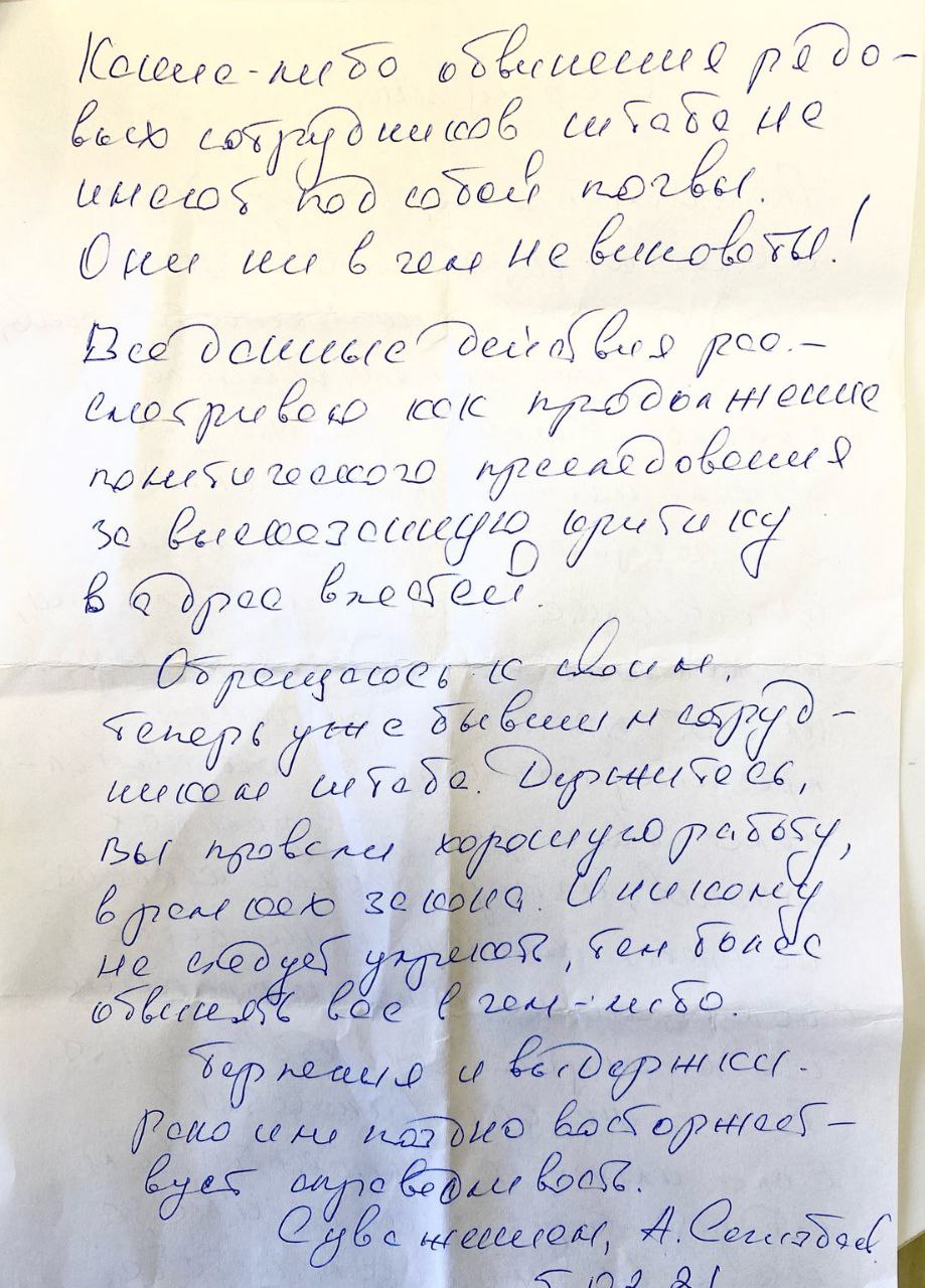 Обращаюсь к своим теперь уже бывшим сотрудникам штаба. Держитесь! Вы провели хорошую работу, в рамках закона. Никому не следует упрекать, тем более обвинять вас в чем-либо.