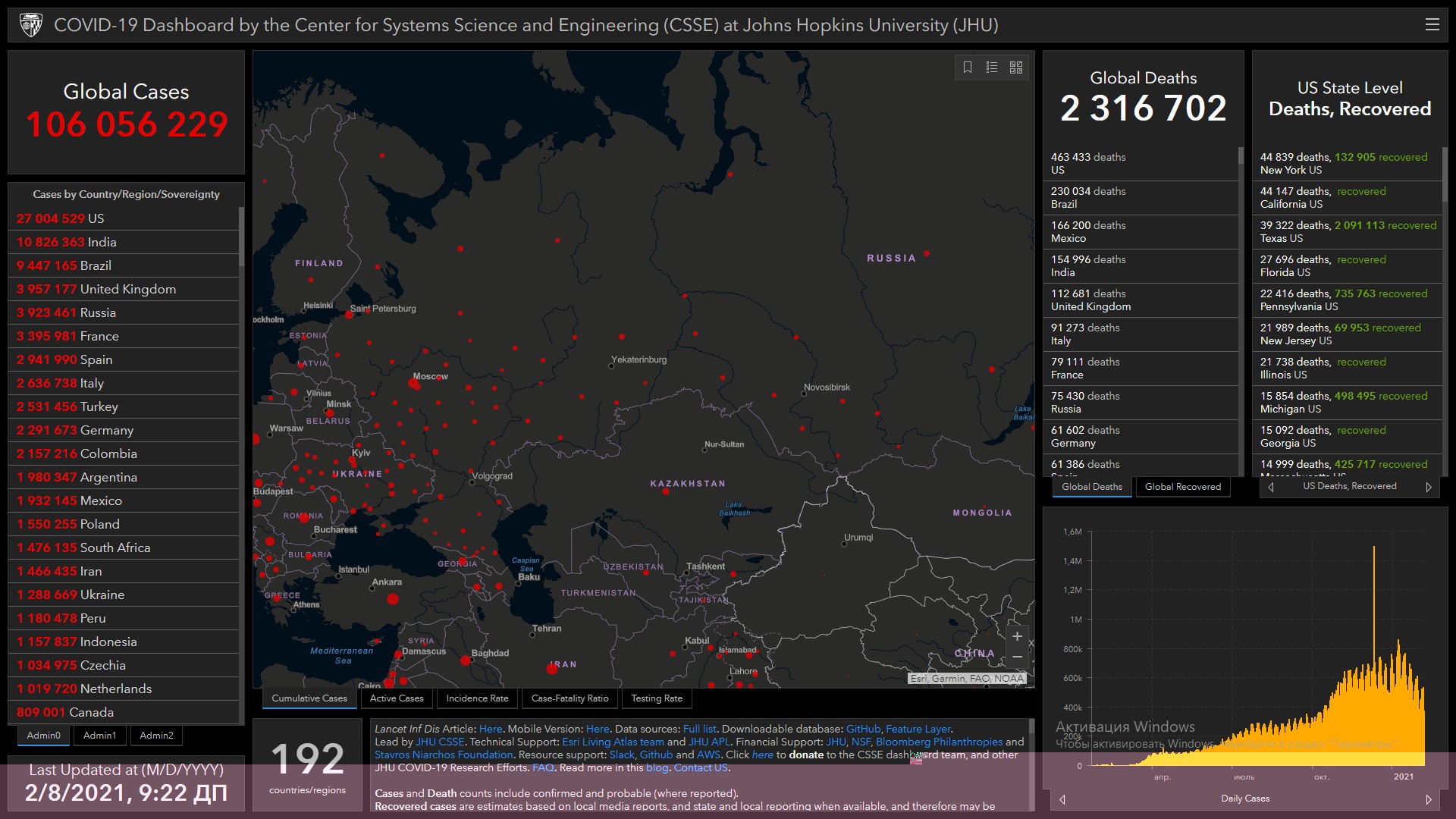 COVID-19 в мире. Заразились более 106 миллионов, умерли более 2,3 миллиона