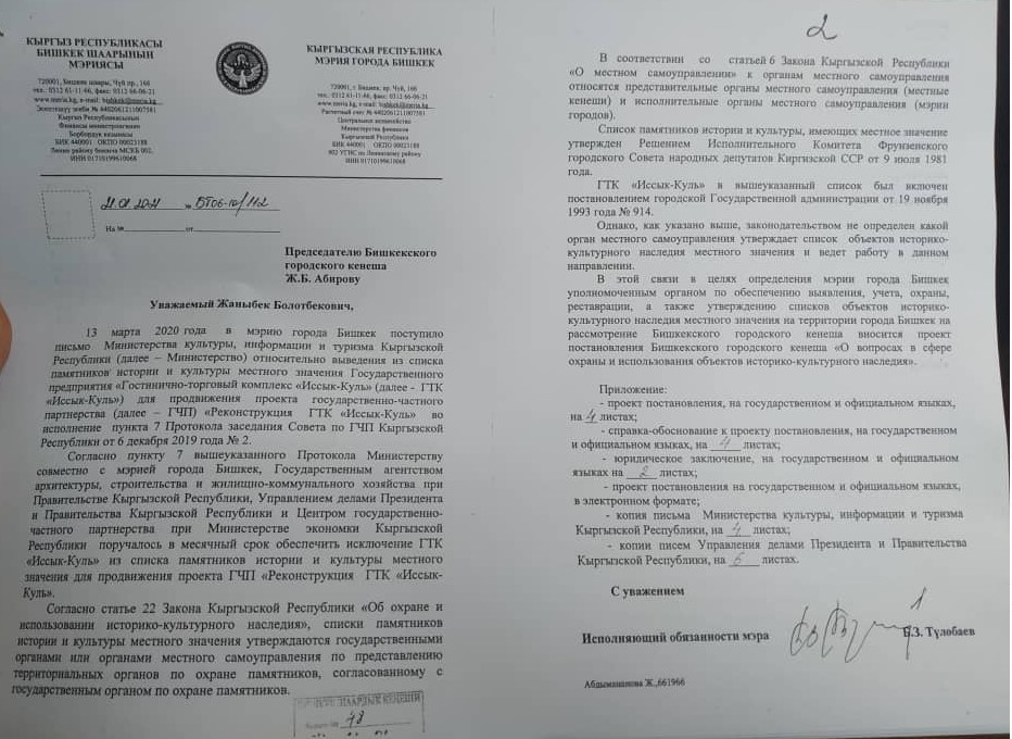 В нем отмечено, что в столичный муниципалитет поступило письмо из Министерства культуры, информации и туризма от 13 марта 2020 года относительно выведения гостиницы из списка памятников для продвижения проекта государственно-частного партнерства «Реконструкция гостинично-торгового комплекса «Иссык-Куль».