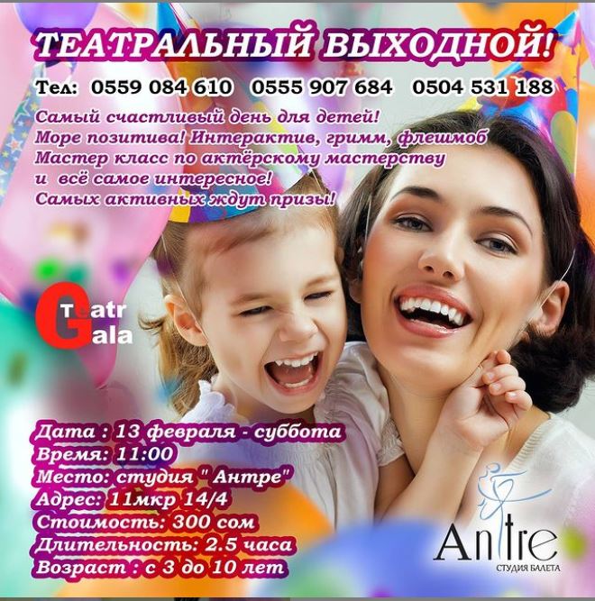 Семейный праздник, на котором вас ждут море позитива, интерактив, грим, флешмоб, мастер-класс по актерскому мастерству. Регистрация по телефону 0559084610.