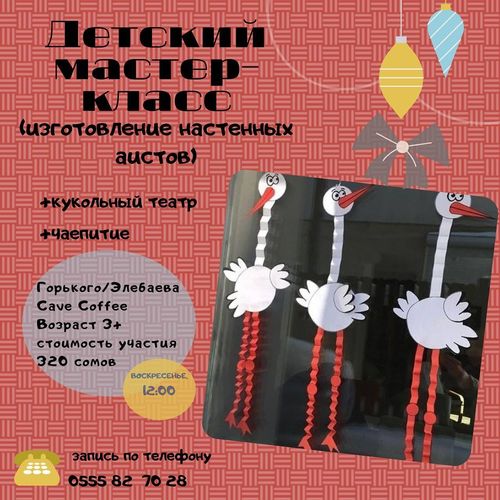 Детишки сделают птичку из подручных материалов. После мастер-класса малышей ждут традиционное чаепитие и кукольный театр. Регистрация по номеру 0555827028.