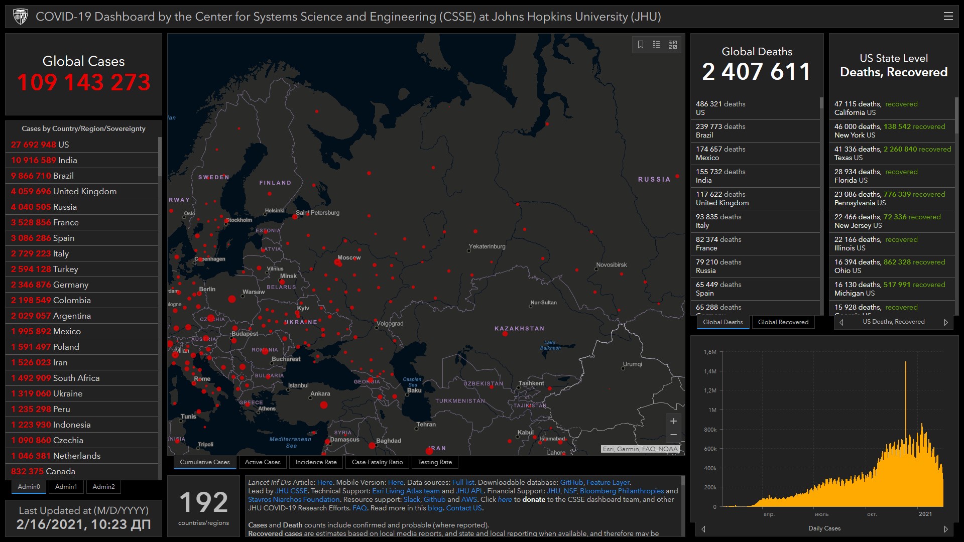 Всего в мире коронавирусом заразились 109 миллионов 143 тысячи 798 человек. Больше всего зараженных в США (27 миллионов 692 тысячи 948), Индии (10 миллионов 916 тысяч 589), Бразилии (9 миллионов 866 тысяч 710), Великобритании (4 миллиона 59 тысяч 696), России (4 миллиона 40 тысяч 505), Франции (3 миллиона 528 тысяч 856), Испании (3 миллиона 86 тысяч 286), Италии (2 миллиона 729 тысяч 223), Турции (2 миллиона 594 тысячи 128), Германии (2 миллиона 346 тысяч 876) и Колумбии (2 миллиона 198 тысяч 549).
