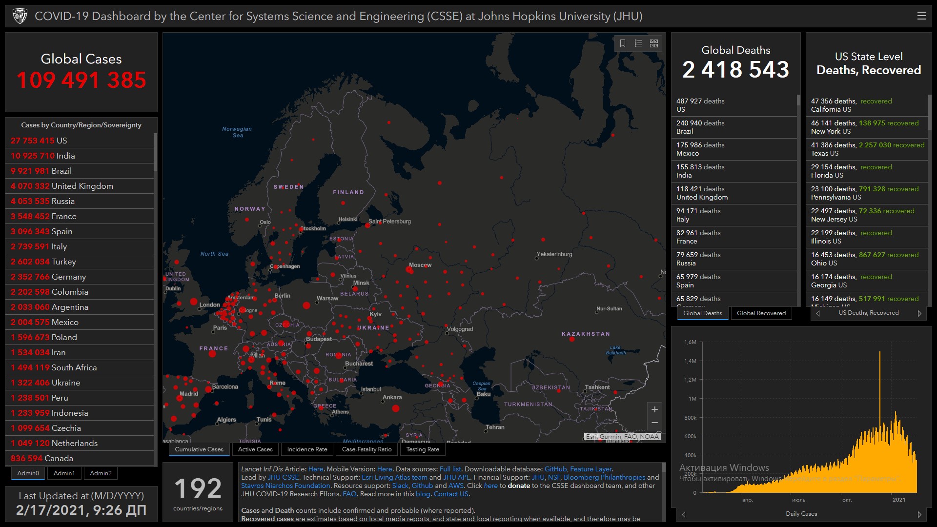 Всего в мире коронавирусом заразились 109 миллионов 491 тысяча 385 человек. Больше всего зараженных в США (27 миллионов 753 тысячи 415), Индии (10 миллионов 925 тысяч 710), Бразилии (9 миллионов 921 тысяча 981), Великобритании (4 миллиона 70 тысяч 332), России (4 миллиона 53 тысячи 535), Франции (3 миллиона 548 тысяч 452), Испании (3 миллиона 96 тысяч 343), Италии (2 миллиона 739 тысяч 591), Турции (2 миллиона 602 тысячи 34), Германии (2 миллиона 352 тысячи 766) и Колумбии (2 миллиона 202 тысячи 598).