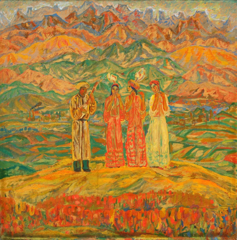 На выставке представлены жанровые картины Мурата Бекджанова, а также плакаты, книжная иллюстрация и портреты.