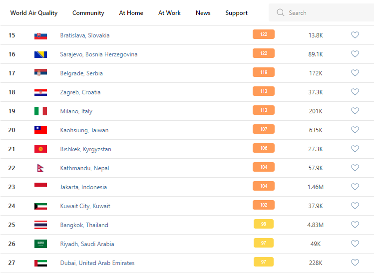 В рейтинге крупнейших городов мира по качеству воздуха World Air Quality Бишкек подялся на 21-е место.