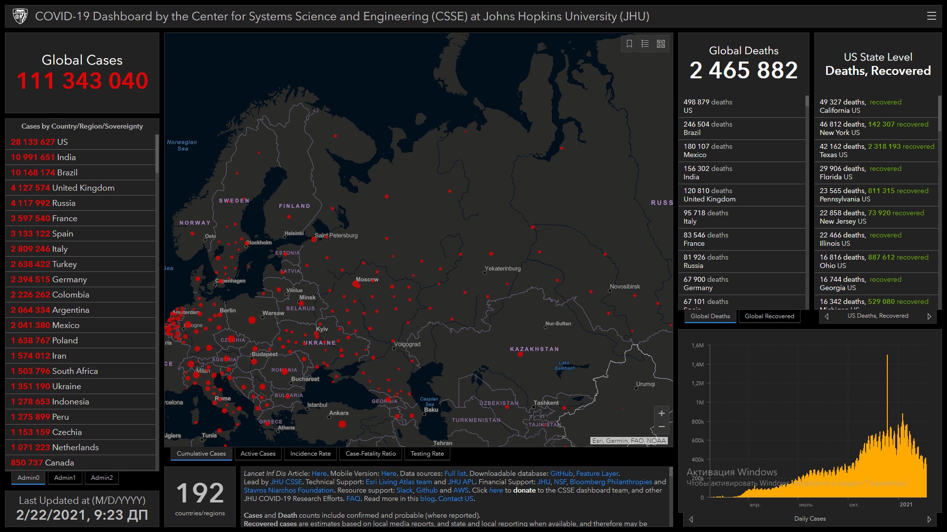 Всего в мире коронавирусом заразились 111 миллионов 343 тысячи 40 человек. Больше всего зараженных в США (28 миллионов 133 тысячи 627), Индии (10 миллионов 991 тысяча 651), Бразилии (10 миллионов 168 тысяч 174), Великобритании (4 миллиона 127 тысяч 574), России (4 миллиона 117 тысяч 992), Франции (3 миллиона 597 тысяч 540), Испании (3 миллиона 133 тысячи 122), Италии (2 миллиона 809 тысяч 246), Турции (2 миллиона 638 тысяч 422), Германии (2 миллиона 394 тысячи 515) и Колумбии (2 миллиона 226 тысяч 262).