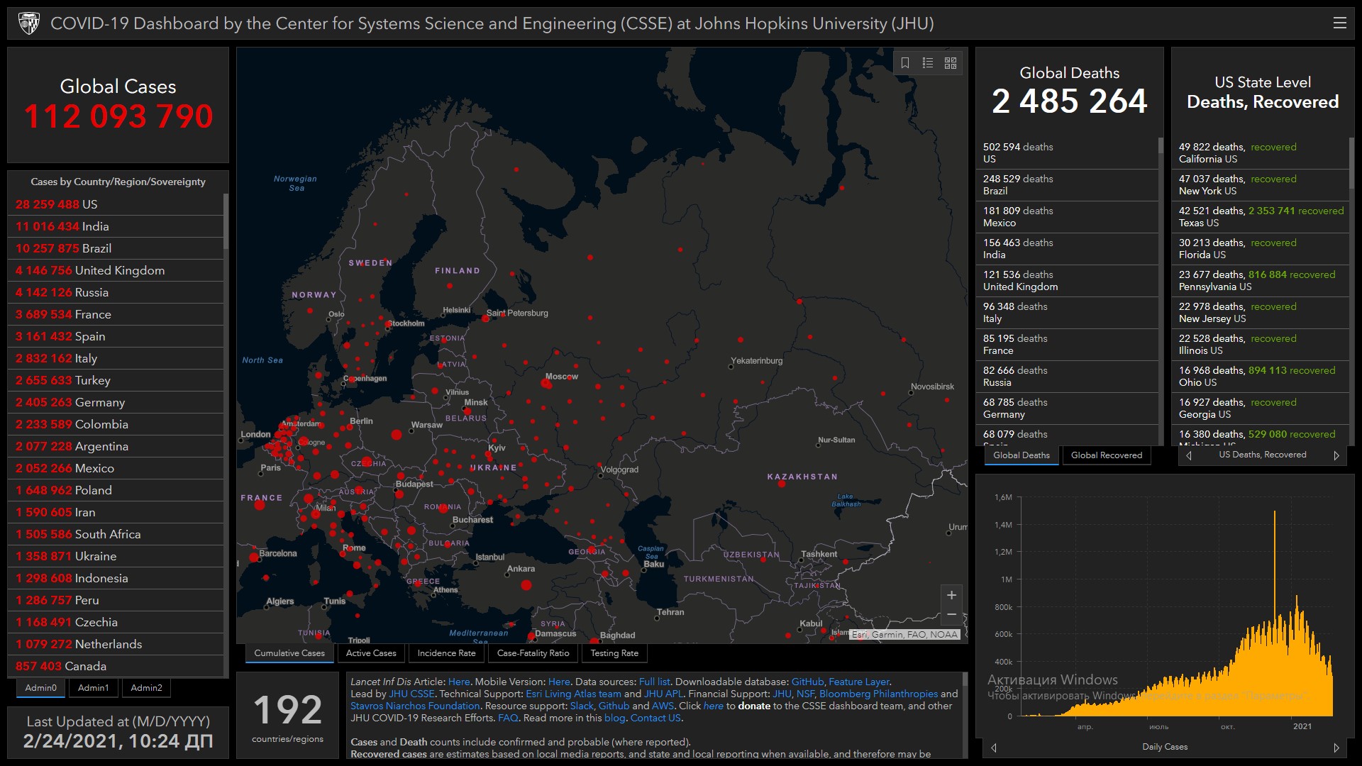 Всего в мире коронавирусом заразились 112 миллионов 93 тысячи 790 человек. Больше всего зараженных в США (28 миллионов 259 тысяч 488), Индии (11 миллионов 16 тысяч 434), Бразилии (10 миллионов 257 тысяч 875), Великобритании (4 миллиона 146 тысяч 756), России (4 миллиона 142 тысячи 126), Франции (3 миллиона 689 тысяч 534), Испании (3 миллиона 161 тысяча 432), Италии (2 миллиона 832 тысячи 162), Турции (2 миллиона 655 тысяч 633), Германии (2 миллиона 405 тысяч 263) и Колумбии (2 миллиона 233 тысячи 589).