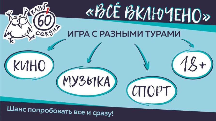 Игра «Все включено» — это попурри из лучших проектов клуба: кино, музыка, спорт, Лига 69 (вопросы 18+). Регистрация по ссылке.