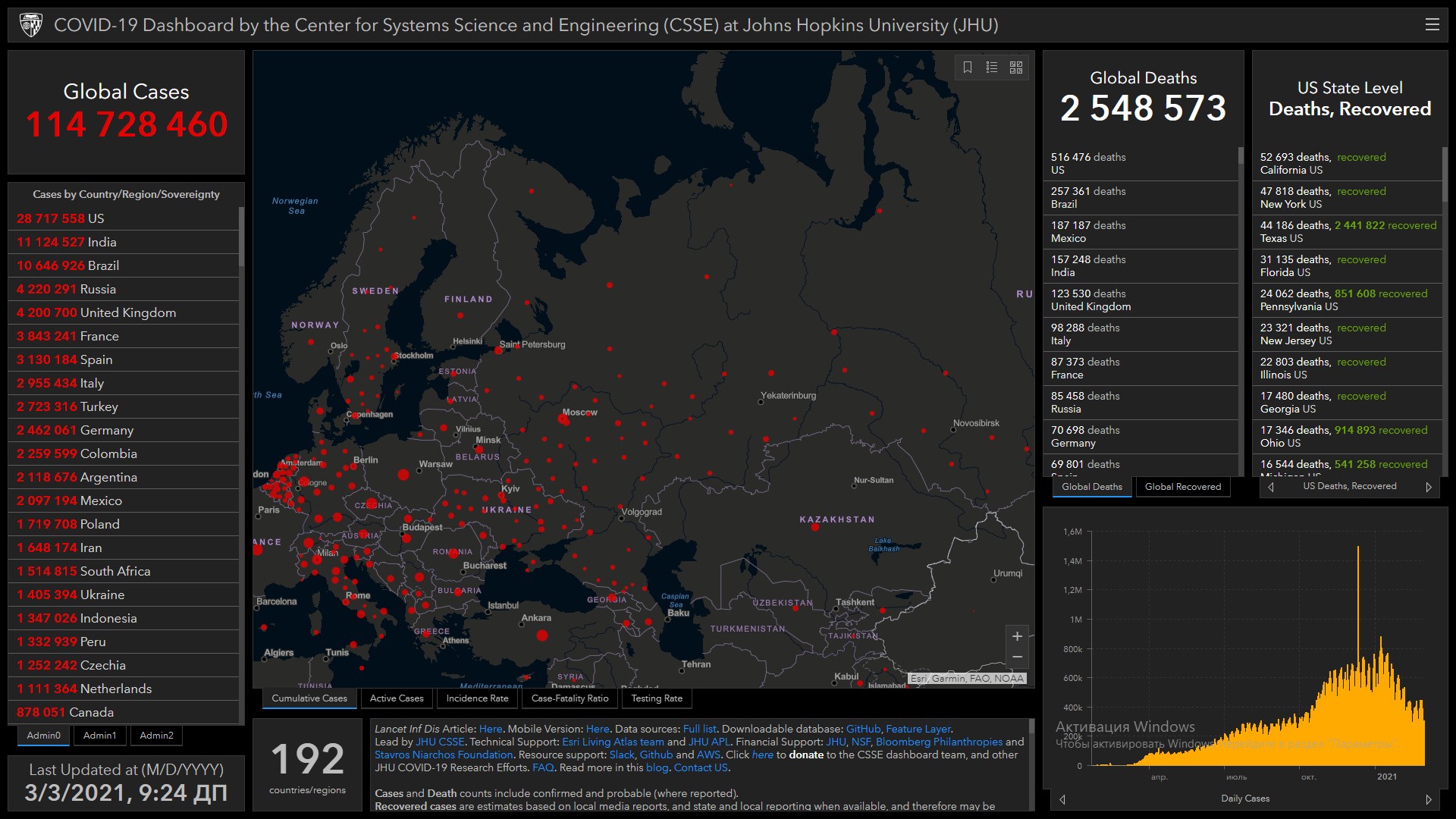 COVID-19 в мире. Заразились более 114,7 миллиона, умерли более 2,5 миллиона