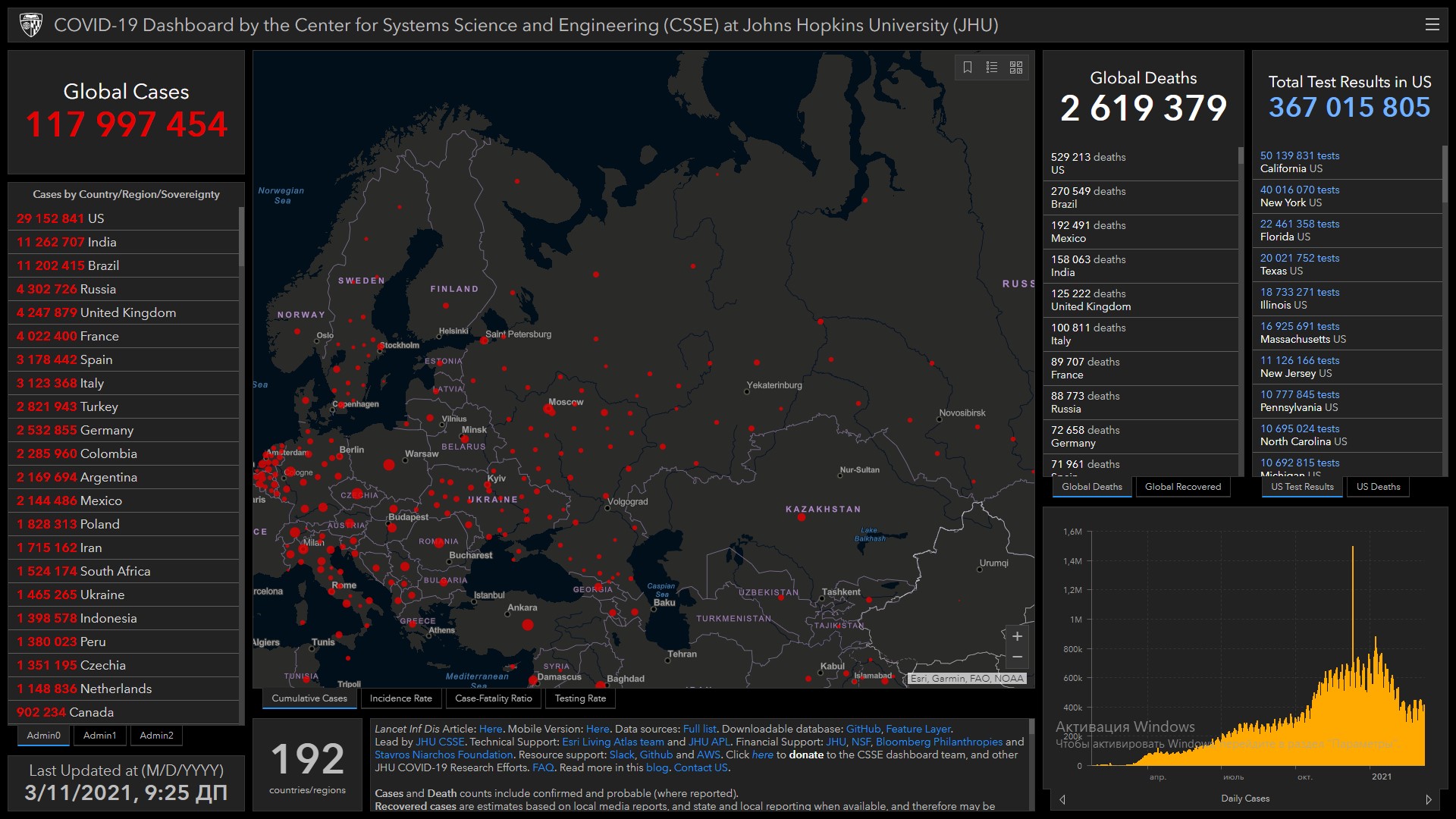 COVID-19 в мире. Заразились более 117,9 миллиона, умерли более 2,6 миллиона