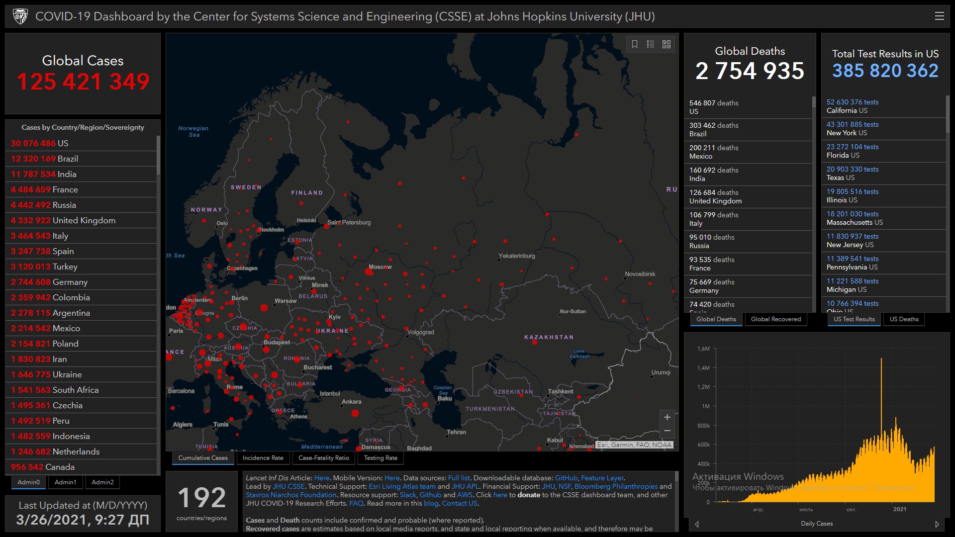 Всего в мире коронавирусом заразились 125 миллионов 421 тысяча 349 человек. Больше всего зараженных в США (30 миллионов 76 тысяч 486), Бразилии (12 миллионов 320 тысяч 169), Индии (11 миллионов 787 тысяч 534), Франции (4 миллиона 484 тысячи 659), России (4 миллиона 442 тысячи 492), Великобритании (4 миллиона 332 тысячи 922), Италии (3 миллиона 464 тысячи 543), Испании (3 миллиона 247 тысяч 738), Турции (3 миллиона 120 тысяч 13), Германии (2 миллиона 744 тысячи 608) и Колумбии (2 миллиона 359 тысяч 942).