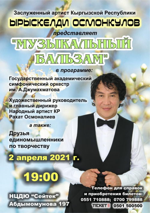 Ырыскелди Осмонкулов приглашает на свой концерт. В программе выступление Государственного академического симфонического оркестра имени Джумахматова, а также друзей и единомышленников по творчеству.