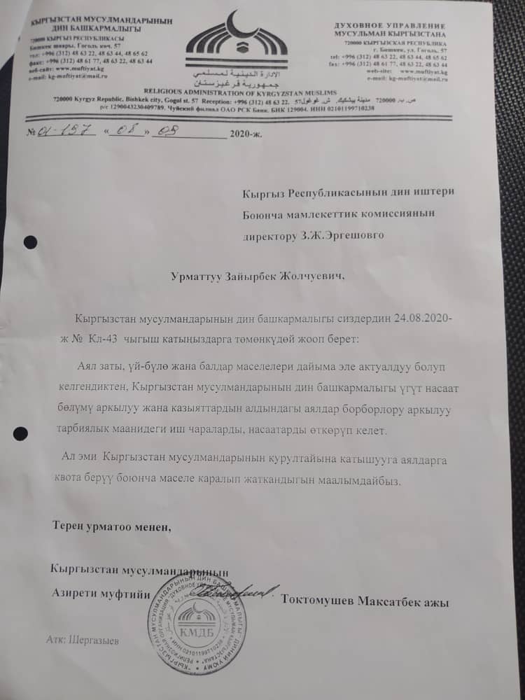 По словам пресс-секретаря ДУМК Максата Атабаева, обращение женщин-мусульманок поступило в Совет улемов, где был получен отрицательный ответ.