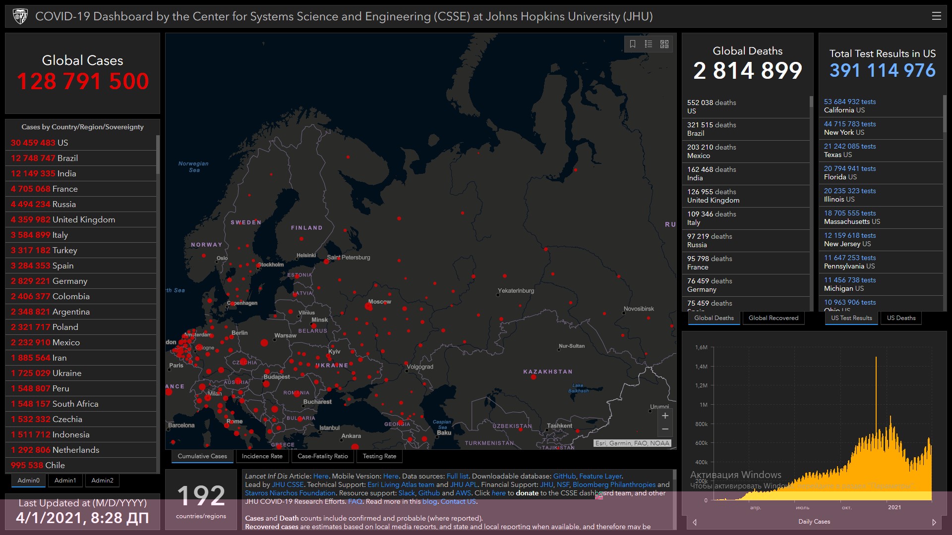 COVID-19 в мире. Заразились более 128,7 миллиона, умерли более 2,8 миллиона