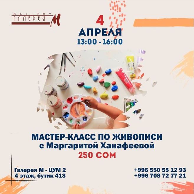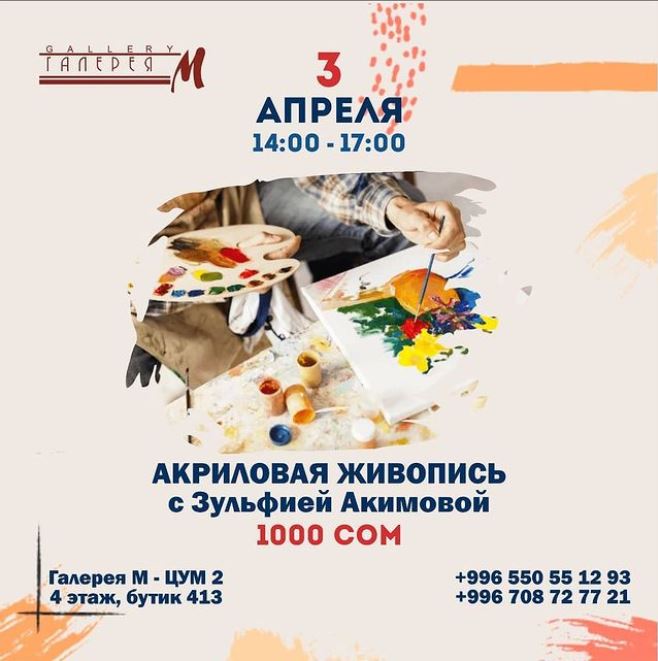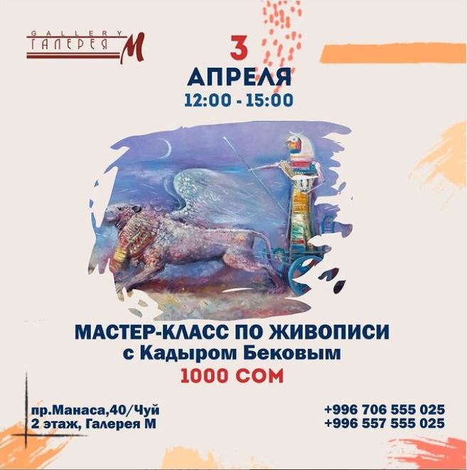 Мастер-класс проведет художник Кадыр Беков. В стоимость включены материалы. Регистрация по телефону 0550551293.
