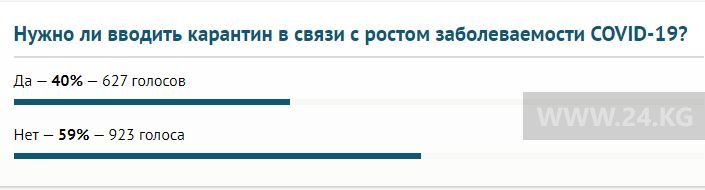 24-kg.com провело опрос среди читателей: считают ли они, что в Кыргызстане или отдельных городах и районах необходимо вводить карантин? В нем приняли участие 1 тысяча 550 человек.