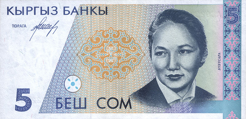 Лицевая сторона купюры номиналом 5 сомов содержала портрет знаменитой кыргызской балерины Бюбюсары Бейшеналиевой. На оборотной стороне было помещено изображение Кыргызского государственного академического театра оперы и балета имени Абдыласа Малдыбаева. Доминирующий цвет купюры — синий.