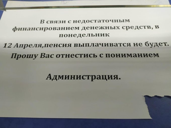 В отделении почты № 40 в Бишкеке предупреждают, что 12 апреля пенсии выплачиваться не будут. Об этом сообщают пользователи социальных сетей.