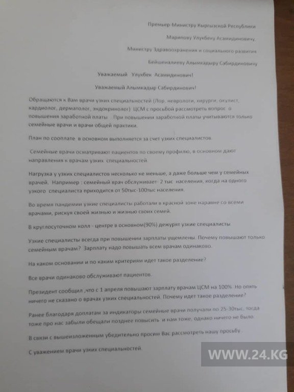 В связи с этим врачи — специалисты узкого профиля обратились к президенту Садыру Жапарову, премьер-министру Улукбеку Марипову, министру здравоохранения и социального развития Алымкадыру Бейшеналиеву с просьбой поднять им заработную плату.