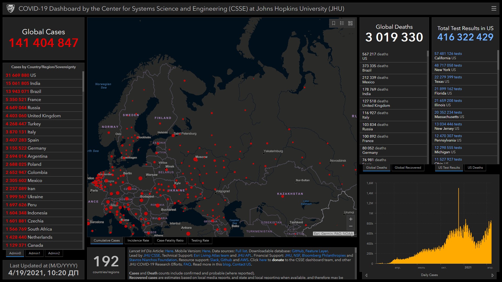 Всего в мире коронавирусом заразились 141 миллион 404 тысячи 847 человек. Больше всего зараженных в США (31 миллион 669 тысяч 880), Индии (15 миллионов 61 тысяча 805), Бразилии (13 миллионов 943 тысячи 71), Франции (5 миллионов 350 тысяч 521), России (4 миллиона 649 тысяч 44), Великобритании (4 миллиона 403 тысячи 60), Турции (4 миллиона 268 тысяч 447), Италии (3 миллиона 870 тысяч 131), Испании (3 миллиона 407 тысяч 283), Германии (3 миллиона 155 тысяч 522), Аргентине (2 миллиона 694 тысячи 14), Польше (2 миллиона 688 тысяч 25) и Колумбии (2 миллиона 652 тысячи 947).