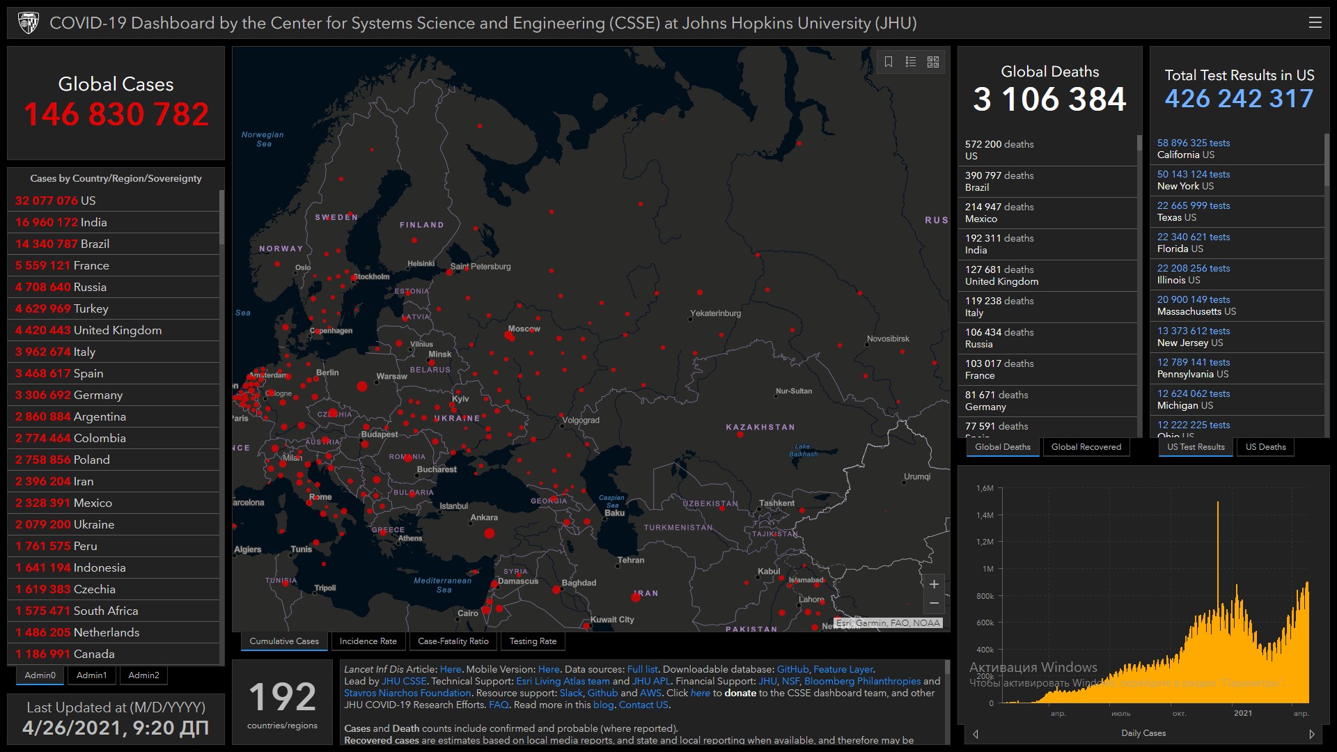 Всего в мире коронавирусом заразились 146 миллионов 830 тысяч 782 человека. Больше всего зараженных в США (32 миллиона 77 тысяч 76), Индии (16 миллионов 960 тысяч 172), Бразилии (14 миллионов 340 тысяч 787), Франции (5 миллионов 559 тысяч 121), России (4 миллиона 708 тысяч 640), Турции (4 миллиона 629 тысяч 969), Великобритании (4 миллиона 420 тысяч 443), Италии (3 миллиона 962 тысячи 674), Испании (3 миллиона 468 тысяч 617), Германии (3 миллиона 306 тысяч 692), Аргентине (2 миллиона 860 тысяч 884), Колумбии (2 миллиона 774 тысячи 464) и Польше (2 миллиона 758 тысяч 856).