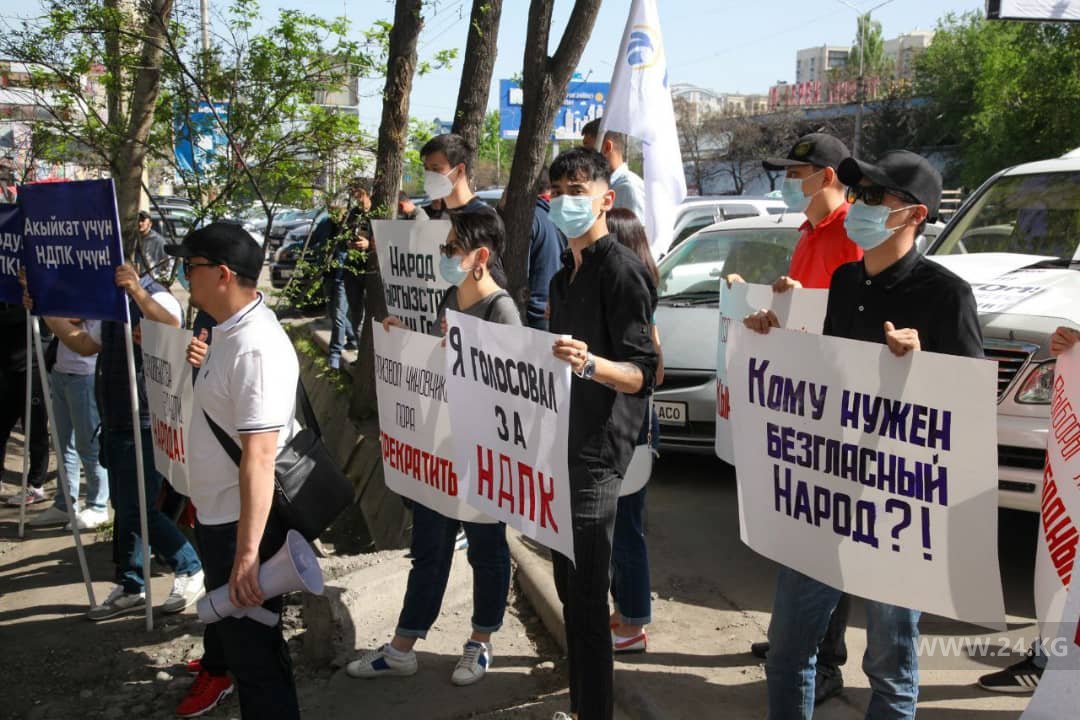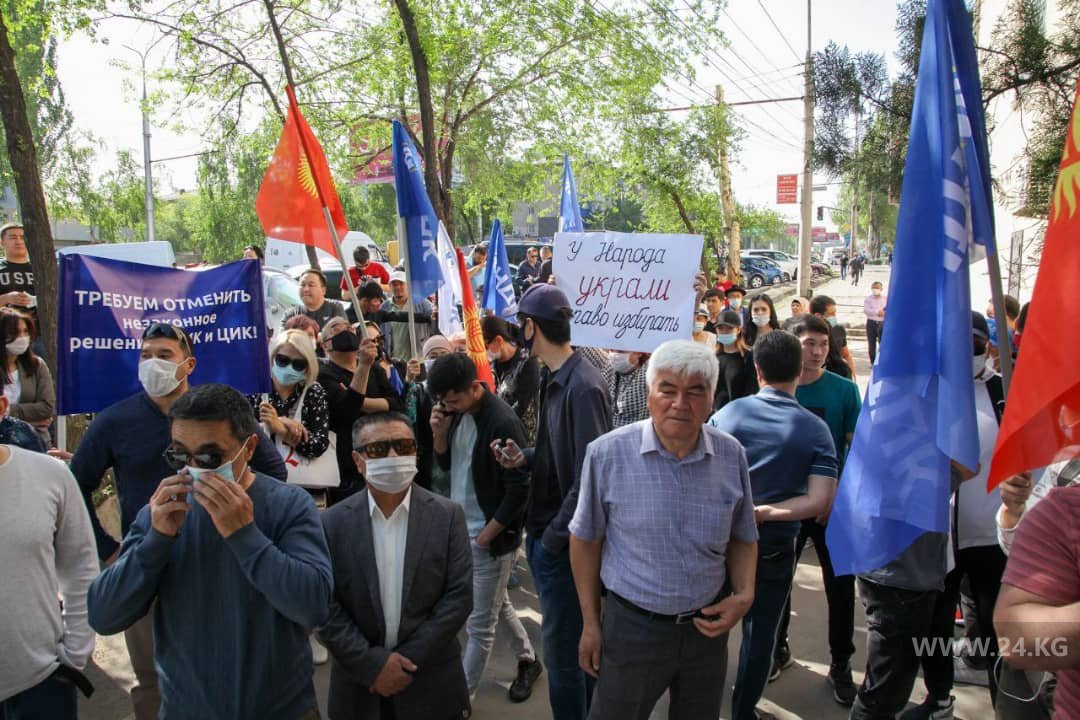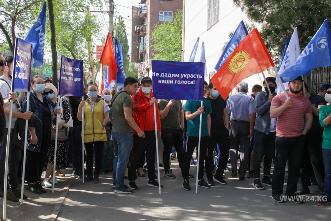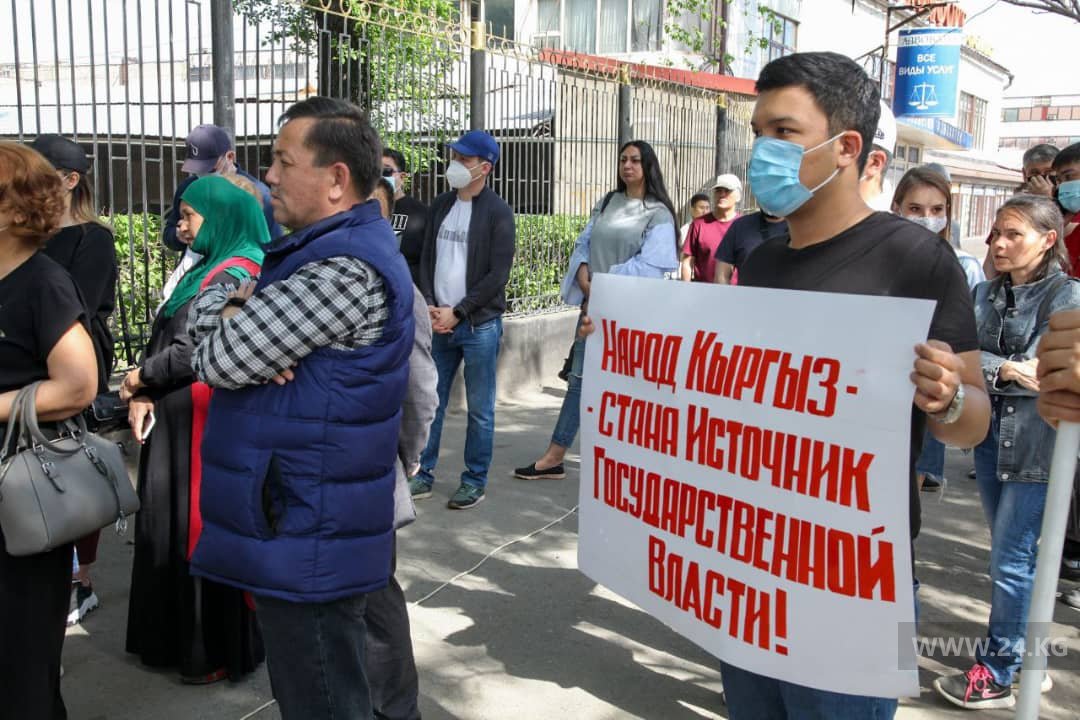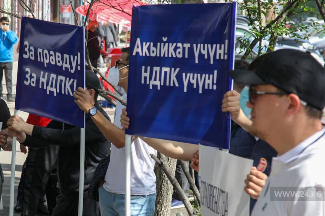 Сторонники партии НДПК митингуют у здания административного суда Бишкека.