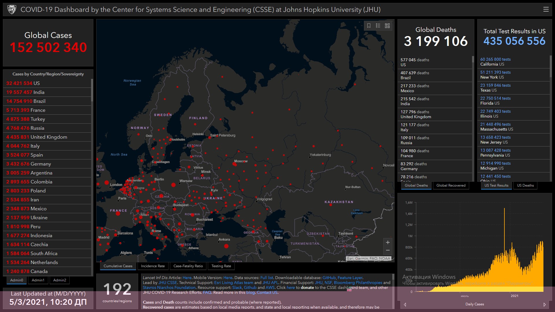 Всего в мире коронавирусом заразились 152 миллиона 502 тысячи 340 человек. Больше всего зараженных в США (32 миллиона 421 тысяча 534), Индии (19 миллионов 557 тысяч 457), Бразилии (14 миллионов 754 тысячи 910), Франции (5 миллионов 713 тысяч 393), Турции (4 миллиона 875 тысяч 388), России (4 миллиона 768 тысяч 476), Великобритании (4 миллиона 435 тысяч 831), Италии (4 миллиона 44 тысячи 862), Испании (3 миллиона 524 тысячи 77), Германии (3 миллиона 432 тысячи 676), Аргентине (3 миллиона 5 тысяч 259), Колумбии (2 миллиона 893 тысячи 655) и Польше (2 миллиона 803 тысячи 233).