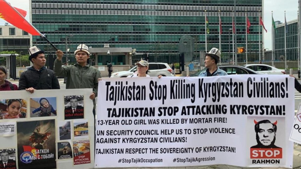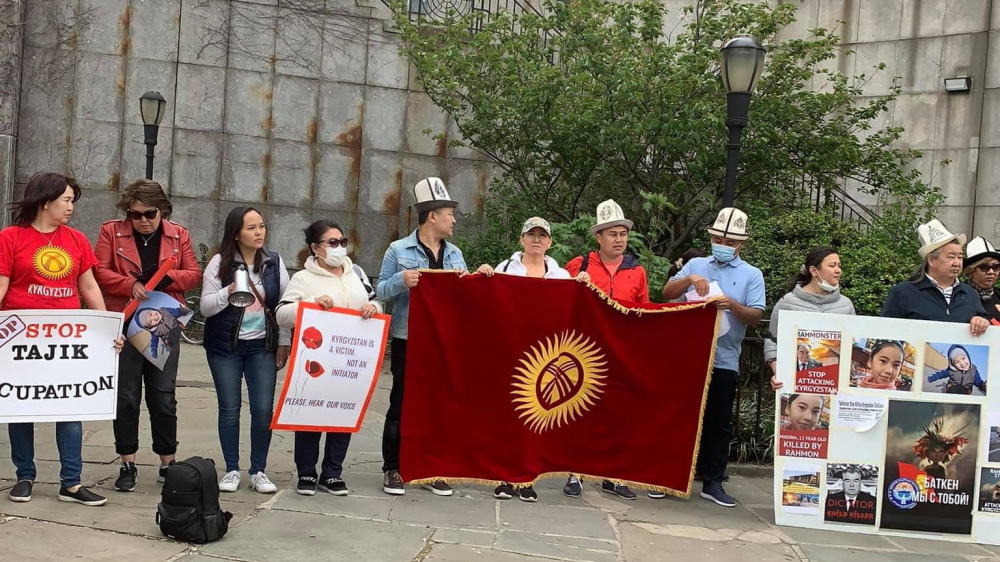 Более десятка кыргызстанцев, проживающих в Нью-Йорке, вышли на мирную акцию с плакатами перед зданием ООН. На плакатах уроженцы республики призывают остановить военную агрессию Таджикистана против Кыргызстана.