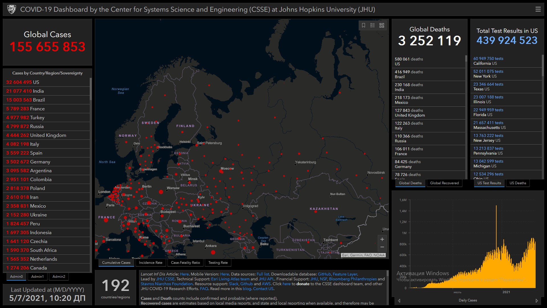 Всего в мире коронавирусом заразились 155 миллионов 655 тысяч 853 человека. Больше всего зараженных в США (32 миллиона 604 тысячи 495), Индии (21 миллион 77 тысяч 410), Бразилии (15 миллионов 3 тысячи 563), Франции (5 миллионов 789 тысяч 283), Турции (4 миллиона 977 тысяч 982), России (4 миллиона 799 тысяч 872), Великобритании (4 миллиона 444 тысячи 262), Италии (4 миллиона 82 тысячи 198), Испании (3 миллиона 559 тысяч 222), Германии (3 миллиона 502 тысячи 672), Аргентине (3 миллиона 95 тысяч 582), Колумбии (2 миллиона 951 тысяча 101) и Польше (2 миллиона 818 тысяч 378).