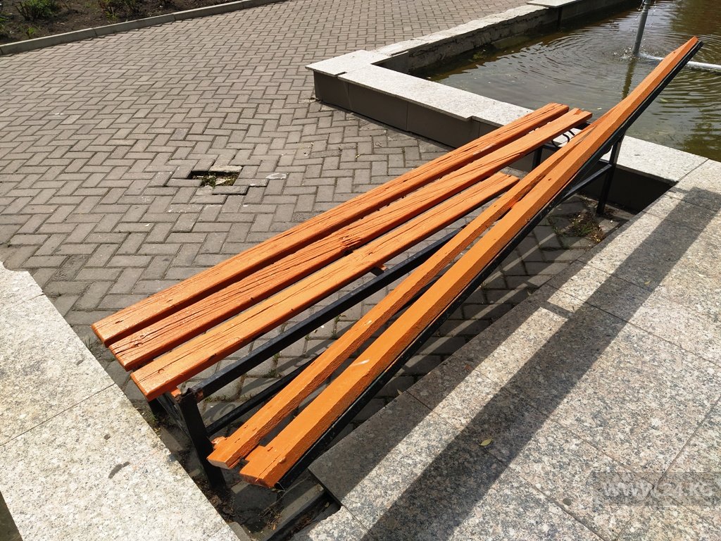 Относительно недавно отреставрированные скамейки — их починили в 2019 году — выглядят неплохо. Но только на первый взгляд. Вандалы уже успели здесь отметиться.