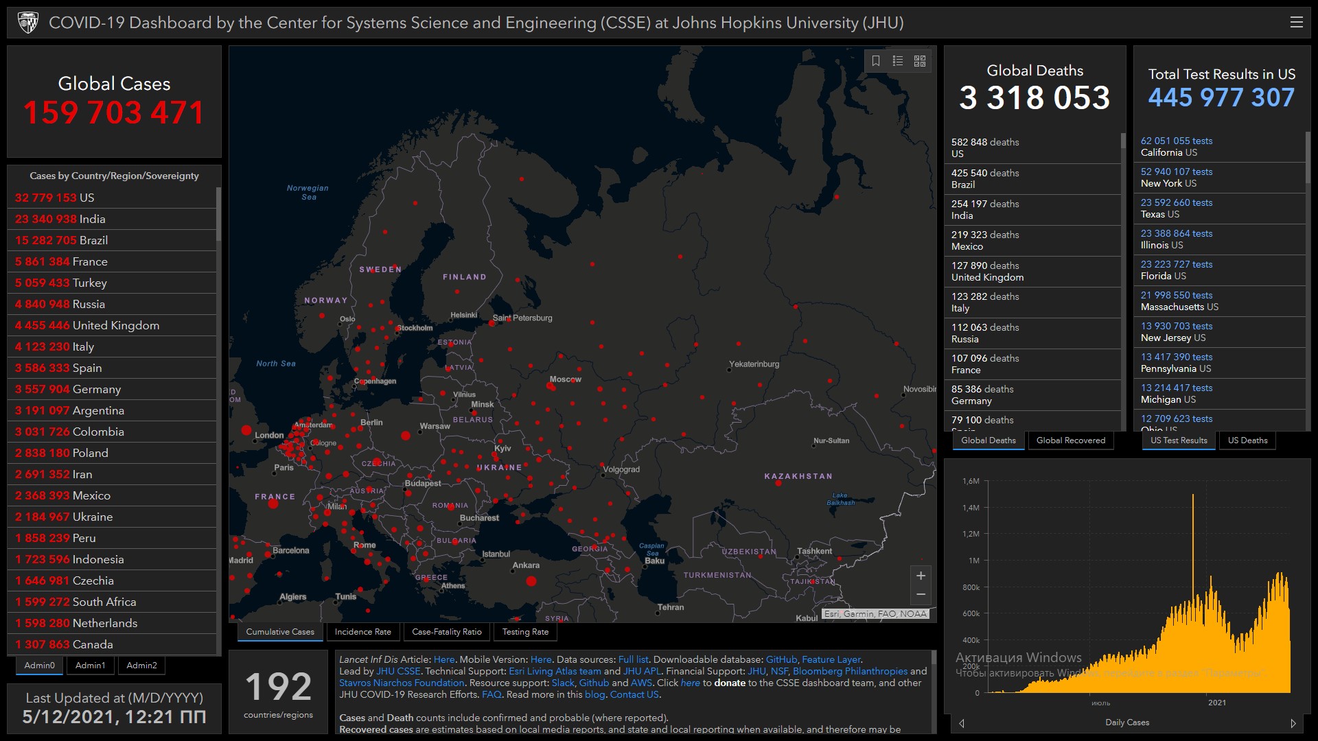 Всего в мире коронавирусом заразились 159 миллионов 703 тысячи 471 человек. Больше всего зараженных в США (32 миллиона 779 тысяч 153), Индии (23 миллиона 340 тысяч 938), Бразилии (15 миллионов 282 тысячи 705), Франции (5 миллионов 861 тысяча 384), Турции (5 миллионов 59 тысяч 433), России (4 миллиона 840 тысяч 948), Великобритании (4 миллиона 455 тысяч 446), Италии (4 миллиона 123 тысячи 230), Испании (3 миллиона 586 тысяч 333), Германии (3 миллиона 557 тысяч 904), Аргентине (3 миллиона 191 тысяча 97), Колумбии (3 миллиона 31 тысяча 726) и Польше (2 миллиона 838 тысяч 180).