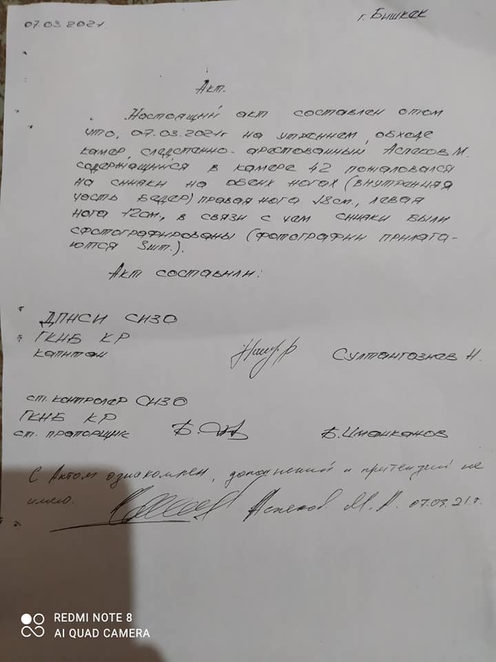 В акте, опубликованном в соцсети, указывается, что следственно-арестованный Мелис Аспеков, содержащийся в камере № 42, пожаловался на синяки на обеих ногах. Гематомы были зафиксированы.