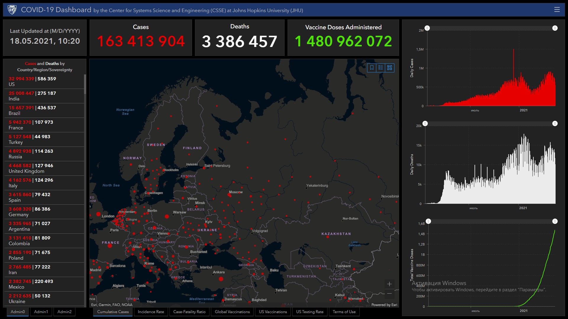 Всего в мире коронавирусом заразились 163 миллиона 413 тысяч 904 человека. Больше всего зараженных в США (32 миллиона 994 тысячи 339), Индии (25 миллионов 8 тысяч 447), Бразилии (15 миллионов 657 тысяч 391), Франции (5 миллионов 942 тысячи 370), Турции (5 миллионов 127 тысяч 548), России (4 миллиона 892 тысячи 938), Великобритании (4 миллиона 468 тысяч 582), Италии (4 миллиона 162 тысячи 576), Испании (3 миллиона 615 тысяч 860), Германии (3 миллиона 608 тысяч 320), Аргентине (3 миллиона 335 тысяч 965), Колумбии (3 миллиона 131 тысяча 410) и Польше (2 миллиона 855 тысяч 190).