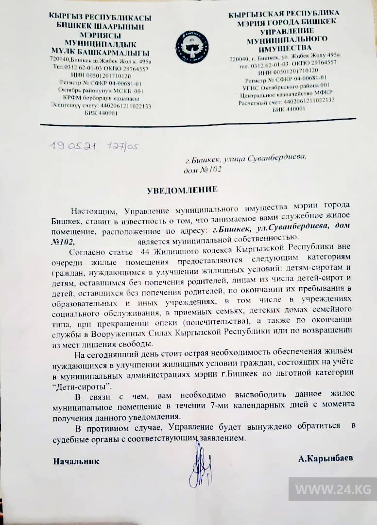 Мэрия поясняет, что управление муниципального имущества (УМИ) исполняло распоряжение муниципалитета от 4 декабря 2020 года об инвентаризации муниципального имущества, в том числе муниципальных служебных и жилых помещений, среди граждан, сдающих эти помещения в аренду, что не соответствует Жилищному кодексу КР.