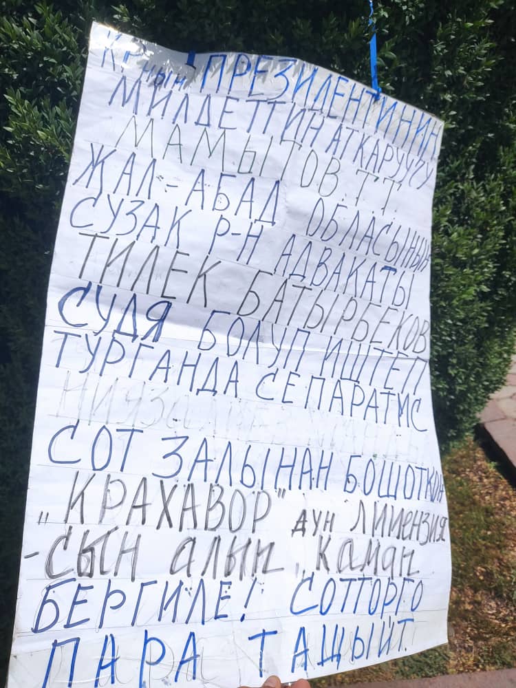 «Я пожаловалась в Генпрокуратуру. Там подтвердили, что у меня отобрали дом незаконно. Известно, что возбуждено новое уголовное дело. Уже не знаю, кому жаловаться, до этого заходила к бывшему председателю Верховного суда Айнаш Токбаевой. Она ничем мне не помогла», — рассказала она.