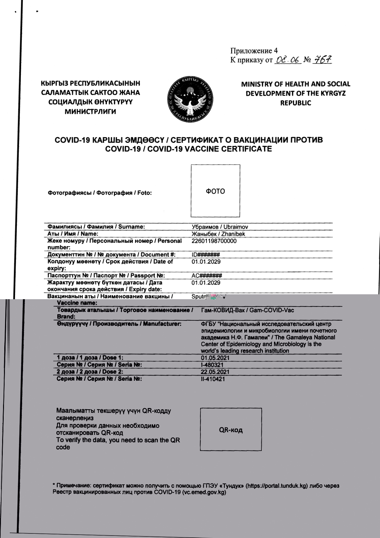 Документ о получении прививки может быть использован при регистрации на посадку из зарубежных стран, а также пересечении границы автотранспортом (в случае признания Кыргызстаном в установленном законом порядке или на взаимных принципах с зарубежными странами).
